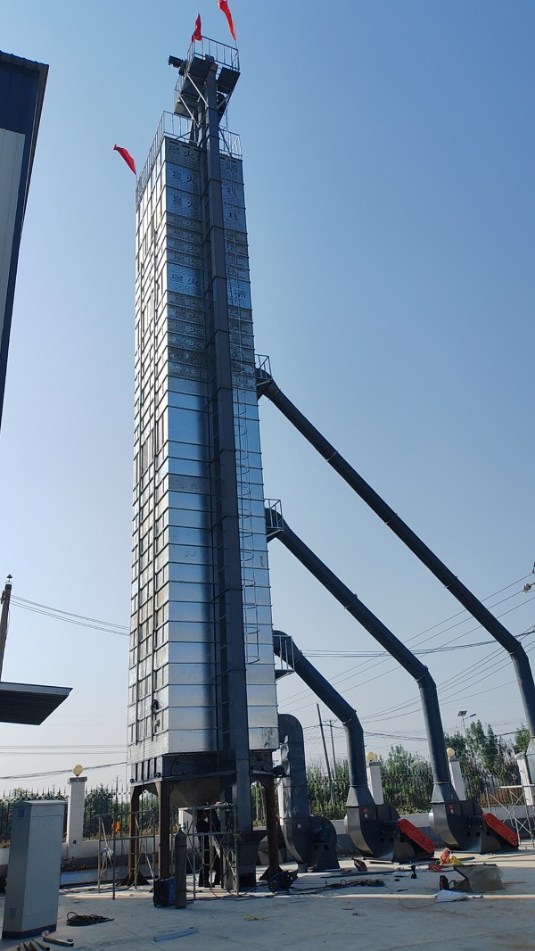 2、热风温度为50℃-160℃,粮食通过布局合理的菱形排布角状盒翻转、流动、受热面积大、均匀无死角,材质全部采用每平方275克热镀锌板,所有电机均采用河南豫通电机股份有限公司,流动平稳,连续作业,成本低,效率高。
