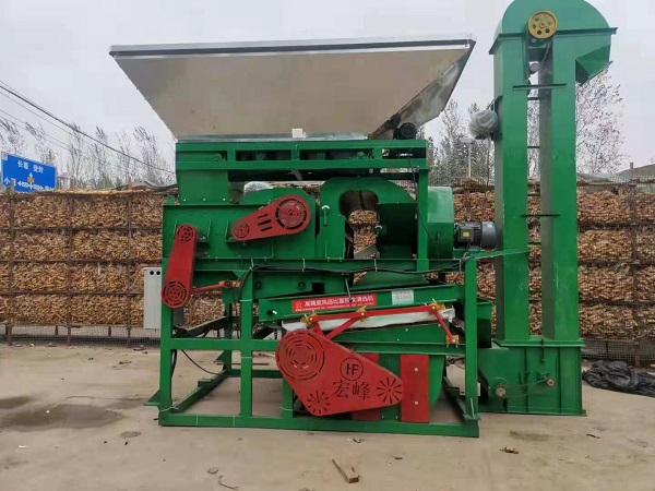 3、采用离心式风机,能有效地吸走玉米中的杂质,送入口袋中,代替了吹风机工作时暴土扬长的场面。